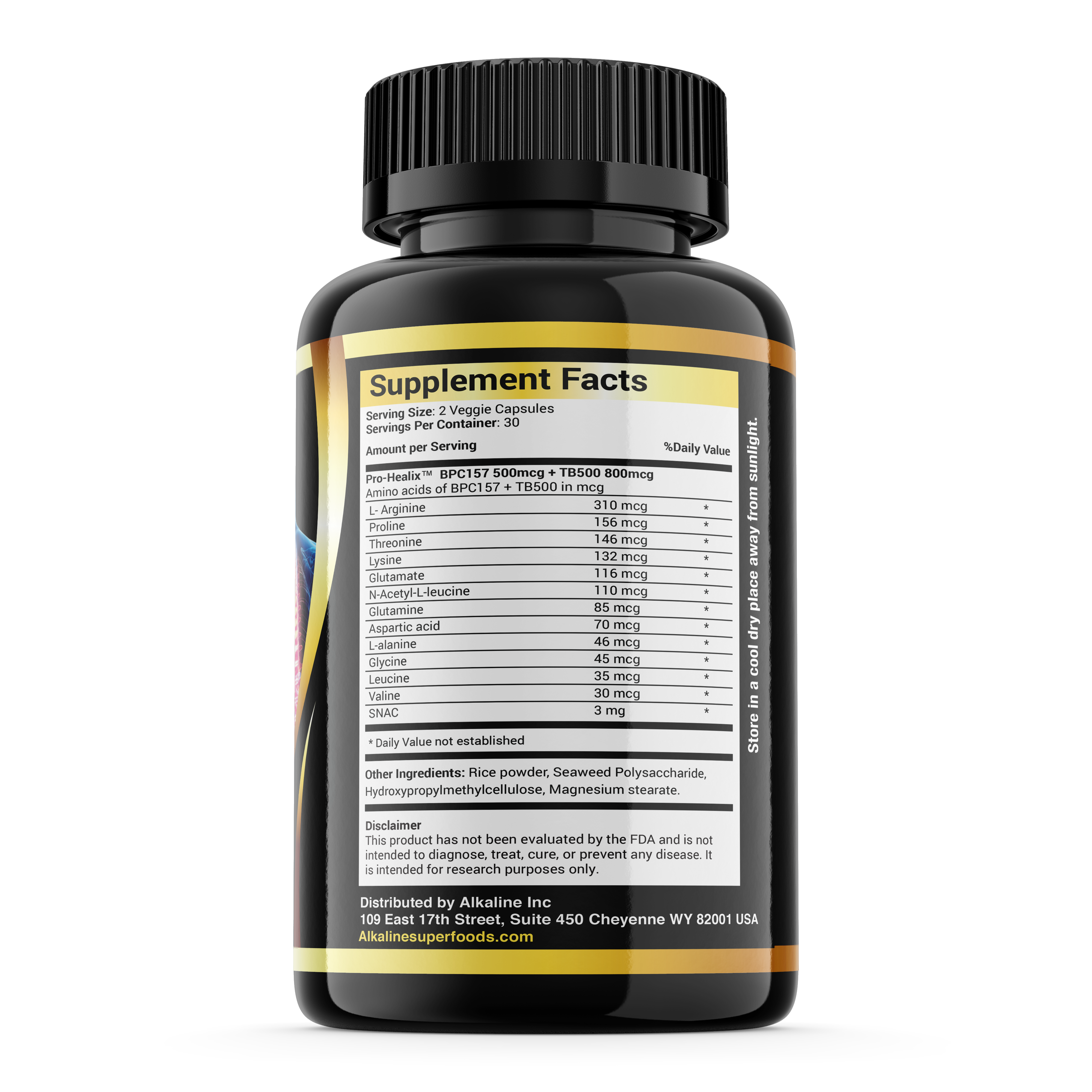 Pro-Healix™: Amino Acid Support for Recovery, Mobility, and Daily Performance Pro-Healix™ is a clean, plant-based amino acid blend formulated to support movement, physical resilience, and active recovery routines. Whether you’re training hard, returning from time off, or simply aiming to feel your best, this formula is designed to complement a consistent, performance-focused lifestyle. Why Choose Pro-Healix™? Developed with mobility and recovery in mind, Pro-Healix™ offers an efficient way to reinforce your body’s natural ability to stay active, adapt to stress, and bounce back with confidence. • Built for Active Recovery – Designed to pair with daily movement, workouts, and wellness routines • Clean and Simple – No stimulants, artificial ingredients, or common allergens • Consistency First – A dependable formula for those who want to stay in rhythm • Trusted by Movers – Popular with athletes, trainers, and individuals who take their recovery seriously • Vegan-Friendly – Gelatin-free capsules with plant-based ingredients What’s Inside Each serving features a carefully selected amino acid profile to support strength, hydration, and focus: • L-Glutamine, L-Arginine, L-Ornithine – Commonly found in routines focused on strength and flexibility • L-Citrulline & Taurine – Often included in blends supporting circulation, hydration, and muscle readiness • L-Tyrosine & DL-Phenylalanine – Popular in recovery-focused stacks for mental clarity and physical endurance Aligned With Your Movement Goals Pro-Healix™ is made for those who prioritize performance and recovery without the clutter. Whether you’re getting back into your flow, maintaining momentum, or supporting your physical rhythm, it’s a reliable addition to your supplement routine—formulated to help you feel strong, ready, and consistent. Order today while supplies last! Ingredients Amino Acids of BPC157 + TB500 L-arginine Proline Threonine Lysine Glutamate N-acetyl-l-leucine Glutamine Aspartic acid L-alanine Glycine Leucine Valine SNAC Our capsules are gel-based and free from animal products, making them suitable for Vegetarians and Vegans. Other Ingredients Rice Powder Seaweed Polysaccharide Hydroxypropylmethylcellulose Magnesium Stearate